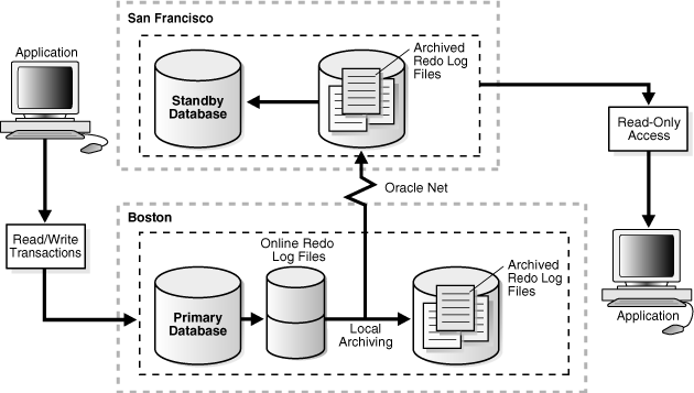 Figure 8-1 shows a two-site Data Guard configuration before the roles of the databases are switched. The primary database is in San Francisco, and the standby database is in Boston.