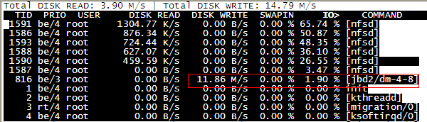 昨天公司的一台NFS服务器遭遇IO居高不下的情况 ,通过iostat查看,io使用率在80%以上,时常还会直接IO飙满,导致NFS的访问异常。重启主机后问题依旧,最后使用iotop查看后,发现主要是jbd2进程在写导致的。具体见下图iotop的结果: