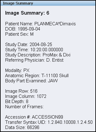 You can rest the mouse on each thumbnail image to view the metadata summary for that installed DICOM image. Figure 8-5 shows the Image Summary area, with a list of fields containing the metadata summary for DICOM image 1 (Image Summary: 1).