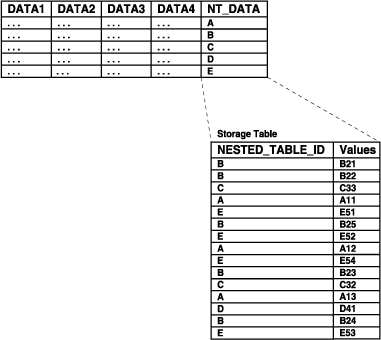 CREATE TABLE people_reltab ( id NUMBER(4) CONSTRAINT pk_people_reltab PRIMARY KEY, employee employee_objtyp phones_ntab phone_ntabtyp) NESTED TABLE phones_ntab STORE AS phone_store_ntab;