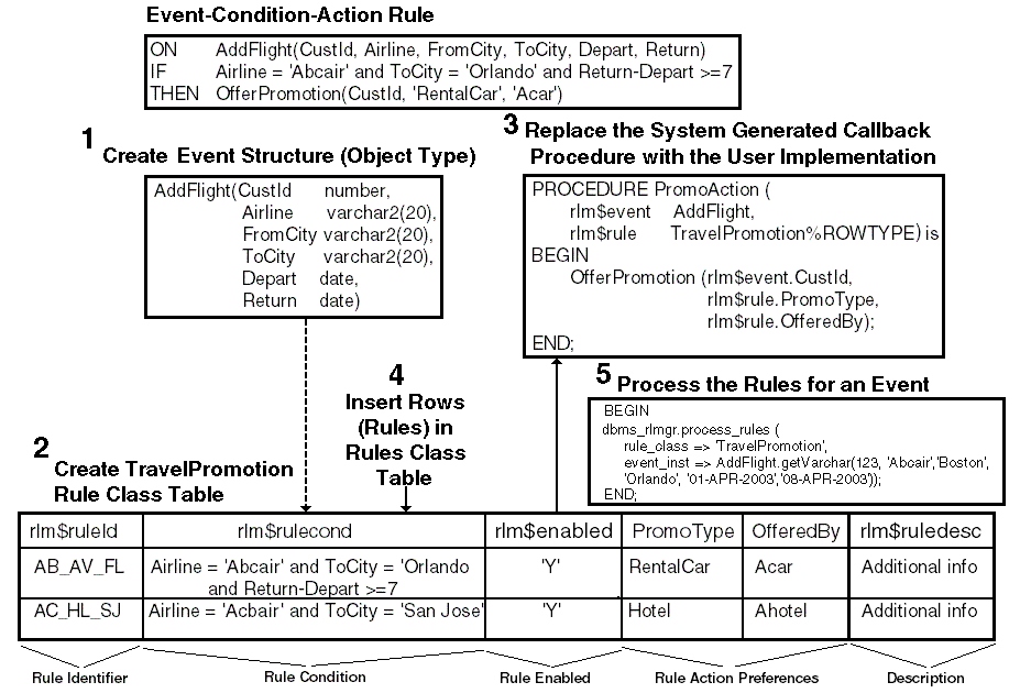 An example of a rule is the following: If a customer chose to fly Abcair Airlines to Orlando and if his stay in Orlando is more than 7 days, then offer an Acar rental car promotion to him. Using the ECA notation, this rule is: