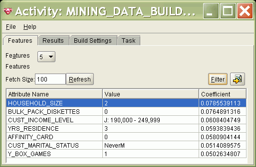 Figure 9-2 shows the results returned by the model ai_sh_sample. The attributes used to build the model are ranked in order of their significance in predicting the target. The results show that household size and marital status have the most effect on whether or not the customer will increase spending with an affinity card. Household size is approximately twice as important as length of residence.