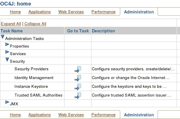 To review the list of commands allowed by this security mechanism, check the file AS_HOME/j2ee/home/config/ct_permissions.properties (it can be specified in the jrt.xml configuration file), which is available after Control Center Agent successfully installs in the OC4J in Application Server.