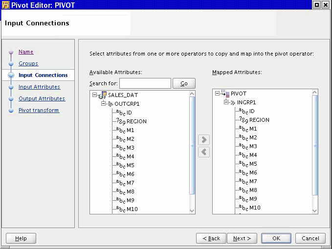 Use the Input Connections page to copy and map attributes into the operator. The attributes you select become mapped members in the input group. The Available Attributes panel displays a list of all the operators in the mapping.