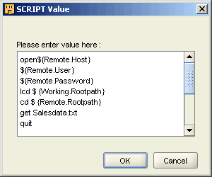 Warehouse Builder displays the SCRIPT Value editor. Write or copy and paste FTP commands into the editor.