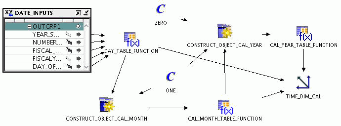 Figure 3-1 displays a mapping to load a calendar time dimension. The Mapping Input operator DATE_INPUTS represents the attributes needed to populate the time dimension. The values of the attributes in this operator are set based on the values you provide when you created the time dimension. You can modify these values by double-clicking the DATE_INPUTS operator, clicking the Output Attributes link, and modifying the values of the input parameters. However, when you modify parameter values, you must regenerate the redeploy the mapping that loads the time dimension.