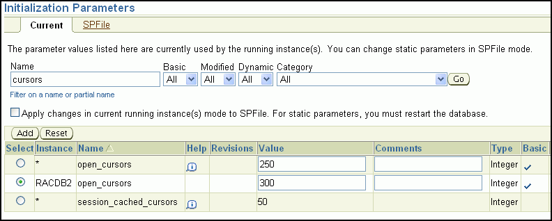 For example, select the parameter OPEN_CURSORS, then click Add. In the new entry for OPEN_CURSORS, select an Instance (for example sales1 or RACDB2), change the Value field to 300.