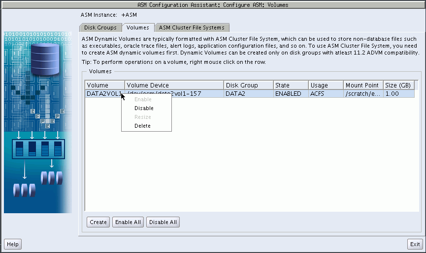 Right click a selected volume in the Oracle ASM Configuration Assistant screen to display the configuration options menu. The menu options include: