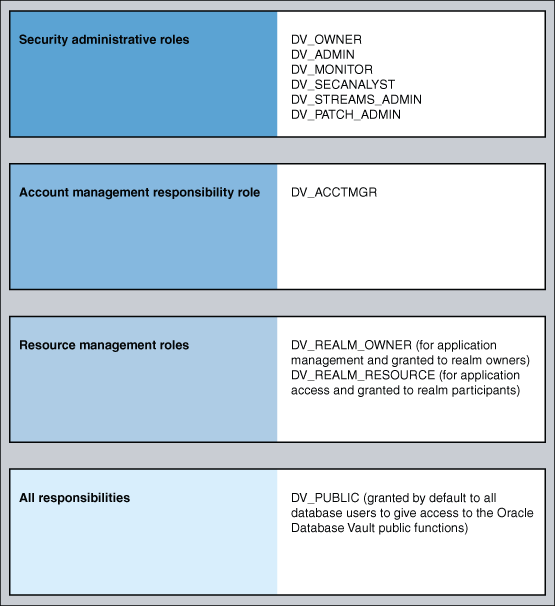 Figure 10-1 illustrates how these roles are designed to implement the first level of separation of duties within the database. How you use these roles depends on the requirements that your company has in place.