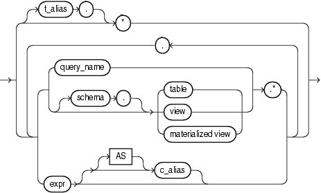 (select_list::=, table_reference::=, join_clause ::=, where_clause::=, hierarchical_query_clause ::=, group_by_clause ::=, model_clause ::=)