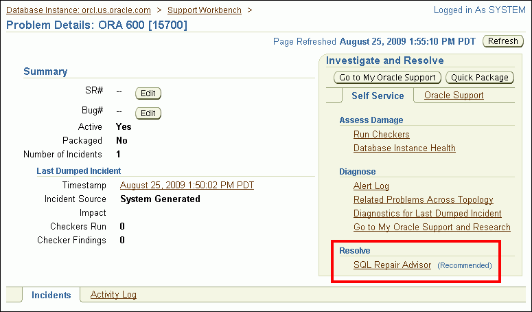 You run the SQL Repair Advisor from the Problem Details page of the Support Workbench. The instructions in this section assume that you were already notified of a critical error caused by your SQL statement and that you followed the workflow described in "Investigating, Reporting, and Resolving a Problem".