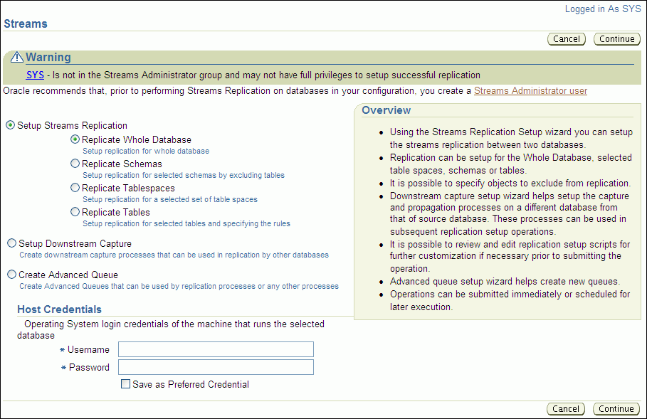 You can identify the current database or a different database in the Host Name, Port, and SID or Service Name fields. The Oracle Streams administrator is created on the database you identify in these fields.