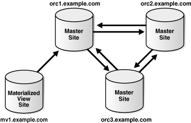 Additionally, all materialized view groups that are based on the same replication group at a single materialized view site must "point" to the same master site or master materialized view site. For example, if the hr_repg materialized view group owned by hr is based on the associated master group at the orc1.example.com master site, then the hr_repg materialized view group owned by personnel must also be based on the associated master group at orc1.example.com, assuming that the hr and personnel owned groups are at the same materialized view site.
