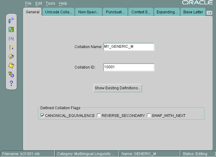Oracle Locale Builder includes online help.When you choose New Language, New Territory, New Character Set, or New Linguistic Sort, the first tab page that you see is labeled General. Click Show Existing Definitions to see the Existing Definitions dialog box.