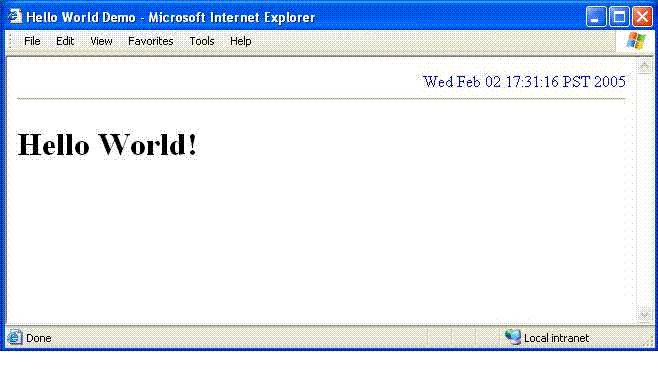 The initial, non-GDK HelloWorld Web application simply prints a "Hello World!" message, along with the current date and time in the top right hand corner of the page. The following code shows the original HelloWorld JSP source code for the preceding image.