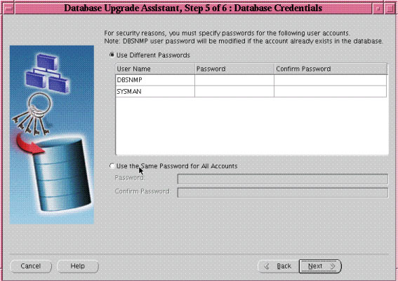 This step is necessary only when upgrading the ASM instance. It is not necessary when upgrading a database to the new Oracle Database 11g release without upgrading ASM.If the default Oracle Database 11g security settings are in place, then passwords must be at least 8 characters, and passwords such as welcome and oracle are not allowed. See Oracle Database Security Guide for more information.