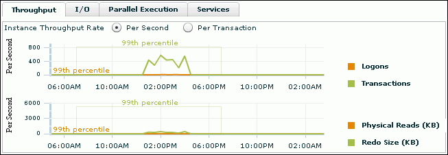 See "Monitoring Instance Activity" for a description of the Throughput, I/O, Parallel Execution, and Services charts.