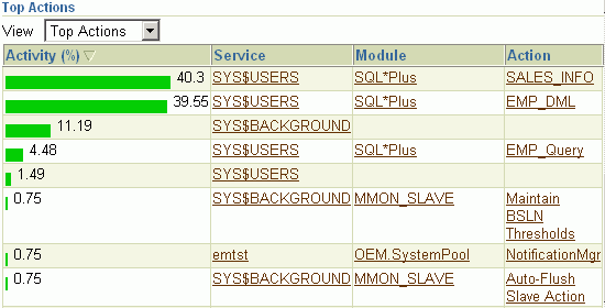 In the example shown in Figure 4-8, the SALES_INFO action associated with the SQL*Plus module is consuming 40.3% of the database activity, while EMP_DML is consuming 39.55% and EMP_QUERY is consuming 4.48%. This information is consistent with Figure 4-5, which shows that the two database sessions for users HR and SH are consuming over 84% of database activity.
