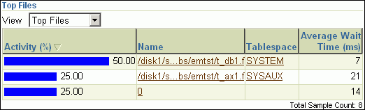The Top Files table displays the average wait time for specific files during the selected time period. This data is available from the Active Sessions Waiting: User I/O page.