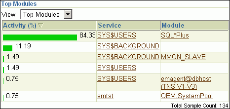 In the example shown in Figure 4-7, the SQL*Plus module is consuming over 84% of database activity and should be investigated. As shown in Figure 4-5, the SQL*Plus session for users sh and hr are consuming a huge percentage of database activity.