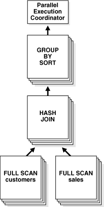 When the parallel execution coordinator examines each operation in a SQL statement's execution plan it will determine the way in which the rows operated on by the operation must be divided or redistributed among the parallel execution servers. As an example of parallel query with intra- and inter-operation parallelism, consider the following query: