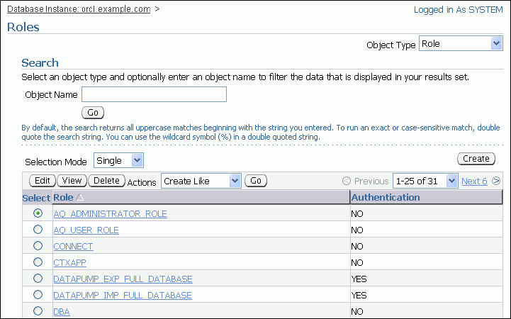 Use the Search area of the page to search for the desired role. In the Object Name field, enter the first few letters of the role, and then click Go.