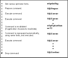 If an application specifies hints to modify the optimizer's behavior, these hints persist until the command is deleted. See "Modifying plan generation"" for more information. For example, when the ODBC SQLPrepare function or JDBC Connection.prepareStatement method is called again on the same handle or when the SQLFreeStmt function or PreparedStatement.close method is called. This means that any intermediate reprepare operations that occur because of invalidations will use those same hints.