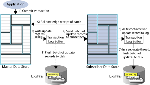 The replication agent on the master data store directs the Data Manager to flush a batch of update records for the committed transactions from the log buffer to a transaction log file. This step ensures that, if the master fails and you need to recover the data store from the checkpoint and transaction log files, the recovered master contains all the data it replicated to the subscriber.